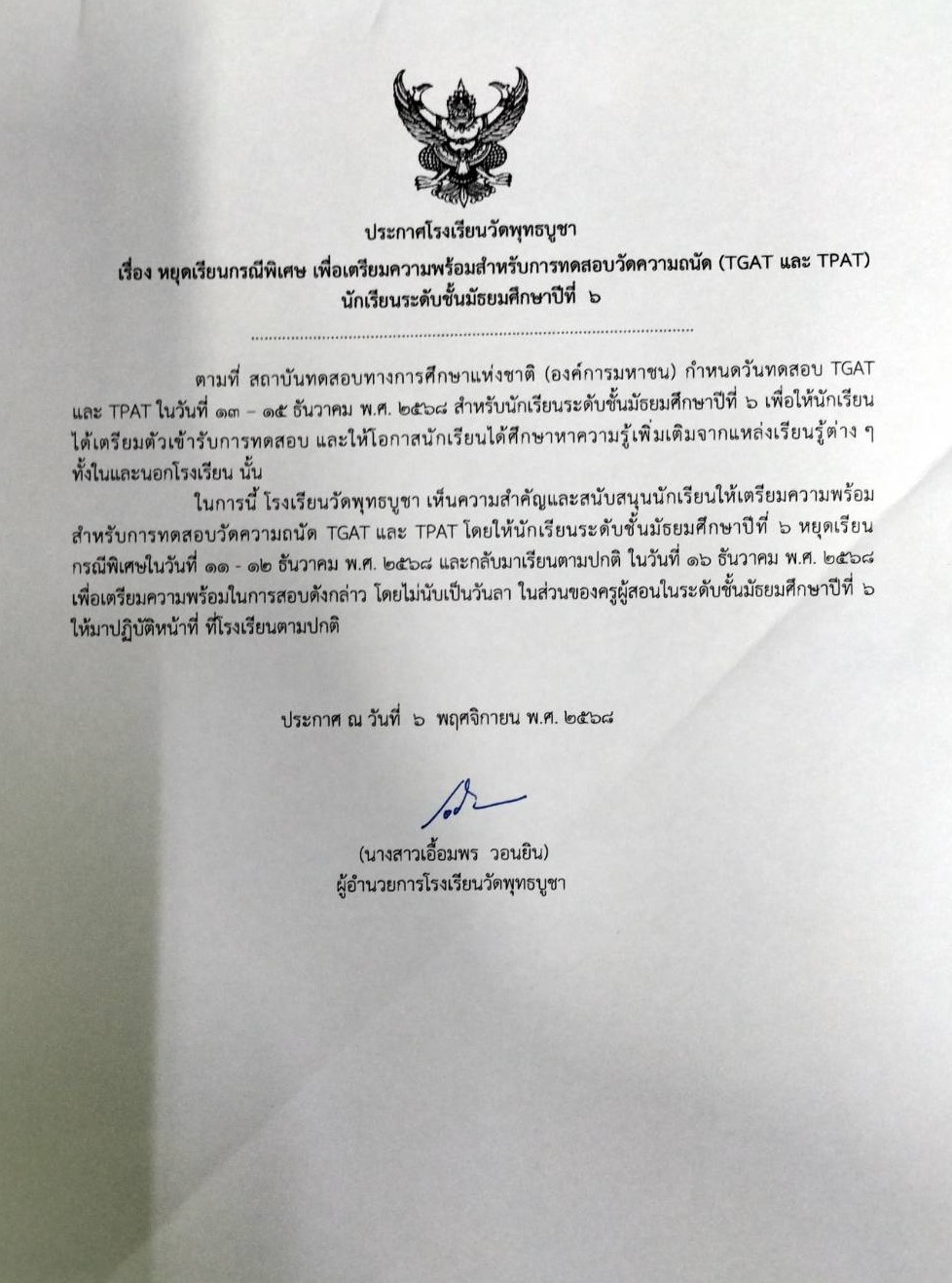 | หยุดเรียนกรณีพิเศษ เฉพาะนักเรียนชั้นมัธยมศึกษาปีที่ 6 เพื่อเตรียมความพร้อมในการสอบ TGAT และ TPAT |