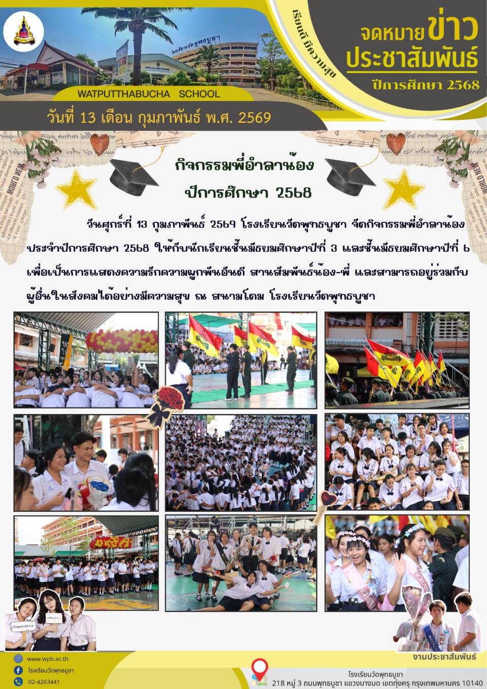 | วันศุกร์ที่ 13 กุมภาพันธ์ 2569 โรงเรียนวัดพุทธบูชา จัดกิจกรรมพี่อำลาน้องประจำปีการศึกษา 2568 ให้กับนักเรียนชั้นมัธยมศึกษาปีที่ 3 และชั้นมัธยมศึกษาปีที่ 6 เพื่อเป็นการแสดงความรักความผูกพันอันดี สานสัมพันธ์น้อง-พี่ และสามารถอยู่ร่วมกับผู้อื่นในสังคมได้อย่างมีความสุข ณ สนามโดม โรงเรียนวัดพุทธบูชา |