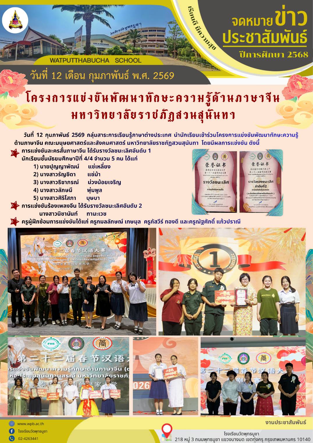 วันที่ 12 กุมภาพันธ์ 2569 กลุ่มสาระการเรียนรู้ภาษาต่างประเทศ นำนักเรียนเข้าร่วมโครงการแข่งขันพัฒนาทักษะความรู้ด้านภาษาจีน คณะมนุษยศาสตร์และสังคมศาสตร์ มหาวิทยาลัยราชภัฏสวนสุนันทา โดยมีผลการแข่งขัน ดังนี้
