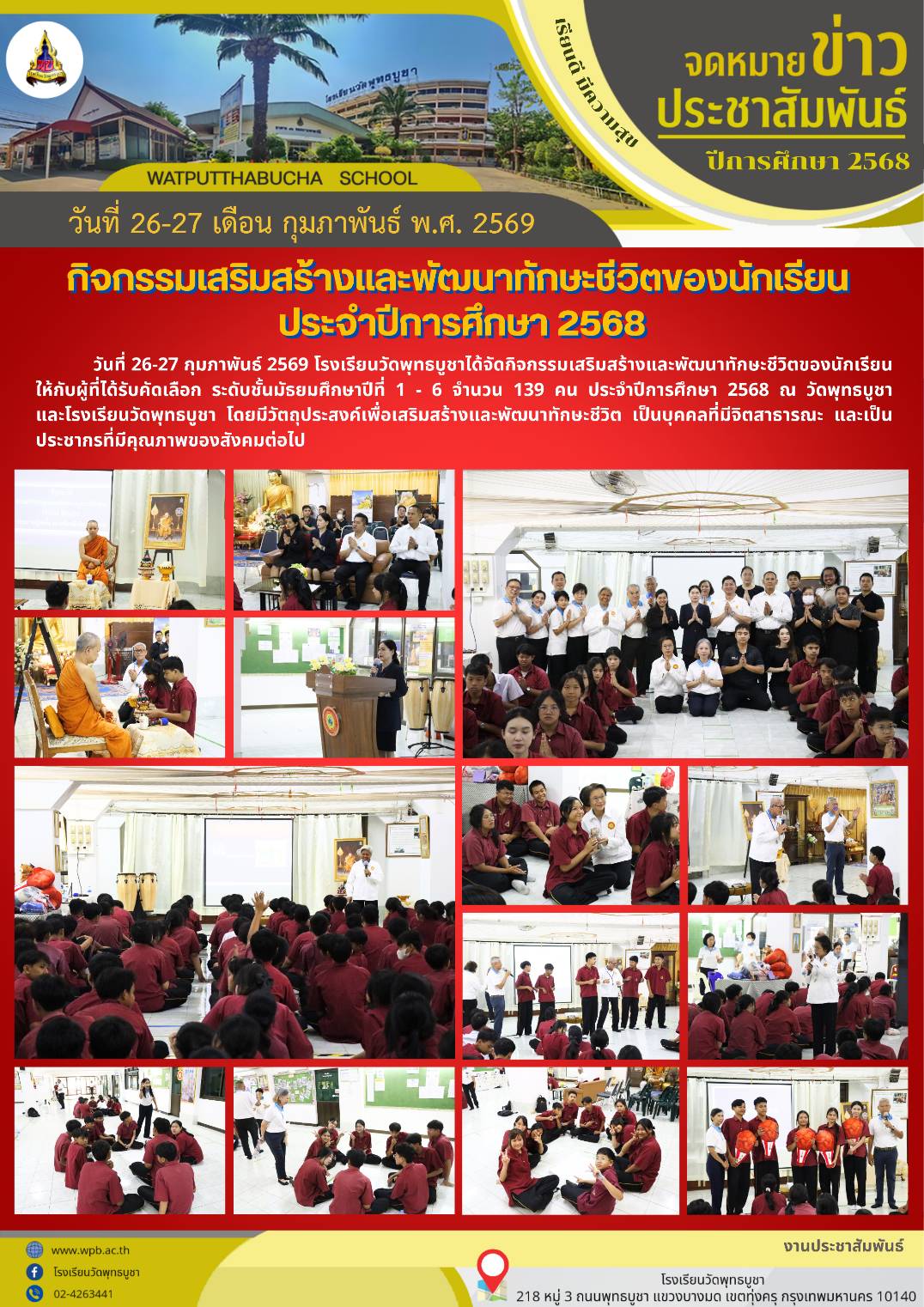 | วันที่ 26-27 กุมภาพันธ์ 2569 โรงเรียนวัดพุทธบูชาได้จัดกิจกรรมเสริมสร้างและพัฒนาทักษะชีวิตของนักเรียน ให้กับผู้ที่ได้รับคัดเลือก ระดับชั้นมัธยมศึกษาปีที่ 1 - 6 ประจำปีการศึกษา 2568 ณ วัดพุทธบูชา และโรงเรียนวัดพุทธบูชา โดยมีวัตถุประสงค์เพื่อเสริมสร้างและพัฒนาทักษะชีวิต เป็นบุคคลที่มีจิตสาธารณะ และเป็นประชากรที่มีคุณภาพของสังคมต่อไป |