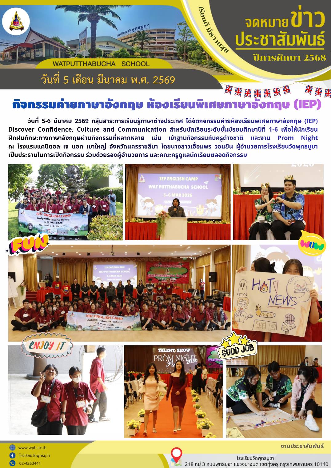 | วันที่ 5-6 มีนาคม 2569 กลุ่มสาระการเรียนรู้ภาษาต่างประเทศ ได้จัดกิจกรรมค่ายห้องเรียนพิเศษภาษาอังกฤษ (IEP) Discover Confidence, Culture and Communication สำหรับนักเรียนระดับชั้นมัธยมศึกษาปีที่ 1-6 เพื่อให้นักเรียนฝึกฝนทักษะทางภาษาอังกฤษผ่านกิจกรรมที่หลากหลาย เช่น เข้าฐานกิจกรรมกับครูต่างชาติ และงาน Prom Night ณ โรงแรมแคปิตอล เจ แอท เขาใหญ่ จังหวัดนครราชสีมา โดยนางสาวเอื้อมพร วอนยิน ผู้อำนวยการโรงเรียนวัดพุทธบูชา เป็นประธานในการเปิดกิจกรรม ร่วมด้วยรองผู้อำนวยการ และคณะครูดูแลนักเรียนตลอดกิจกรรม |