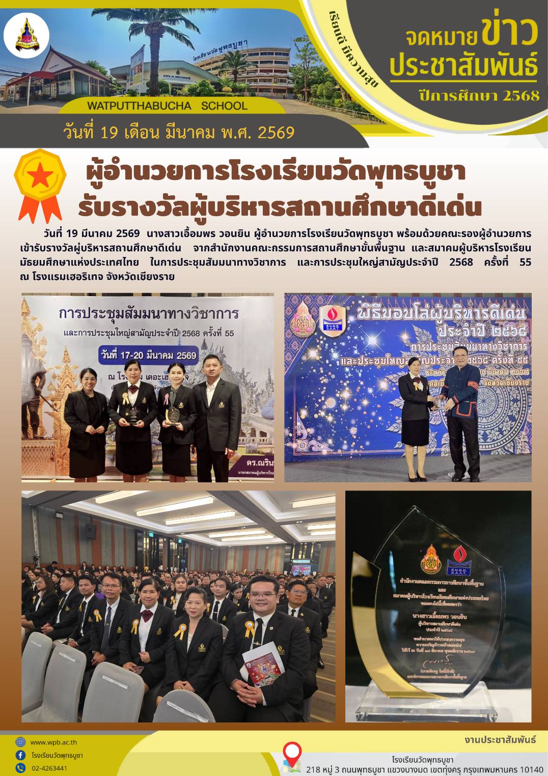 | วันที่ 19 มีนาคม 2569 นางสาวเอื้อมพร วอนยิน ผู้อำนวยการโรงเรียนวัดพุทธบูชา พร้อมด้วยคณะรองผู้อำนวยการ เข้ารับรางวัลผู้บริหารสถานศึกษาดีเด่น จากสำนักงานคณะกรรมการสถานศึกษาขั้นพื้นฐาน และสมาคมผู้บริหารโรงเรียนมัธยมศึกษาแห่งประเทศไทย ในการประชุมสัมมนาทางวิชาการ และการประชุมใหญ่สามัญประจำปี 2568 ครั้งที่ 55 ณ โรงแรมเฮอริเทจ จังหวัดเชียงราย |