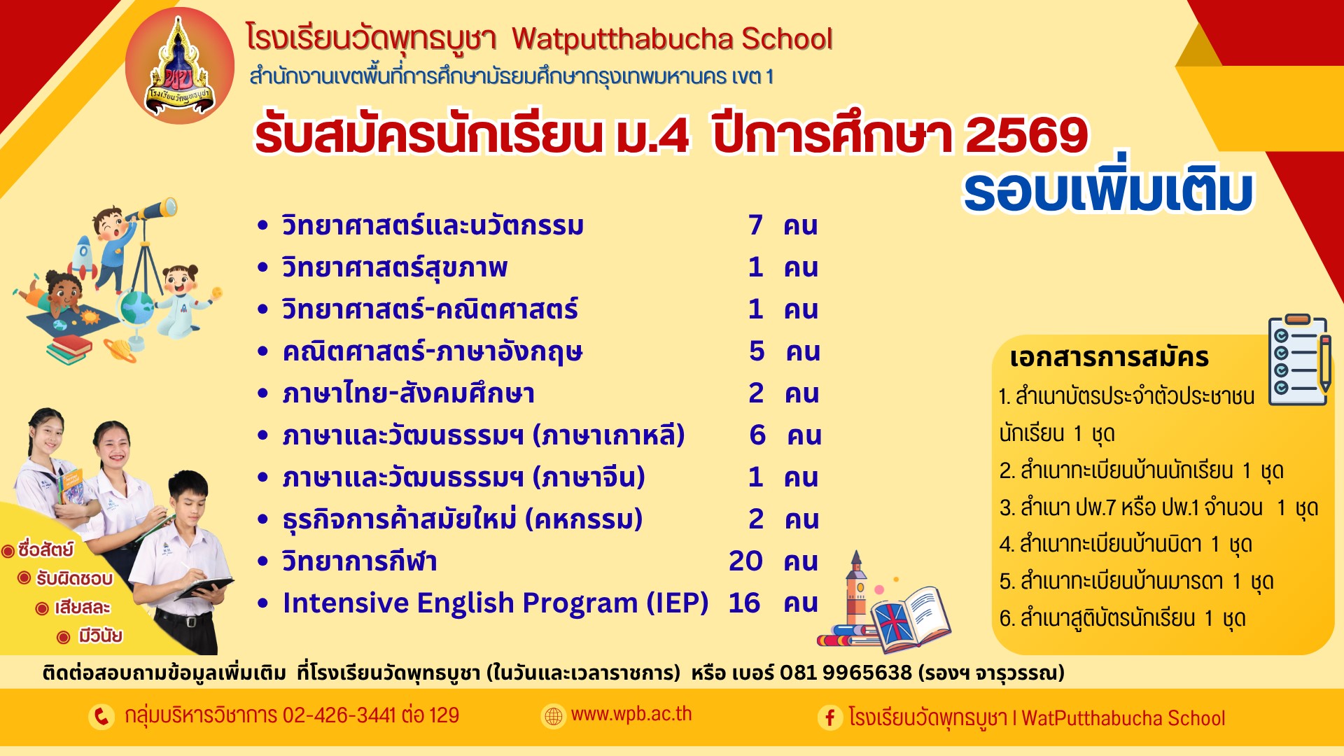 โรงเรียนวัดพุทธบูชา (สพม. กท1) เปิดรับสมัครนักเรียนชั้น ม.4 ปีการศึกษา 2569 (เพิ่มเติม)