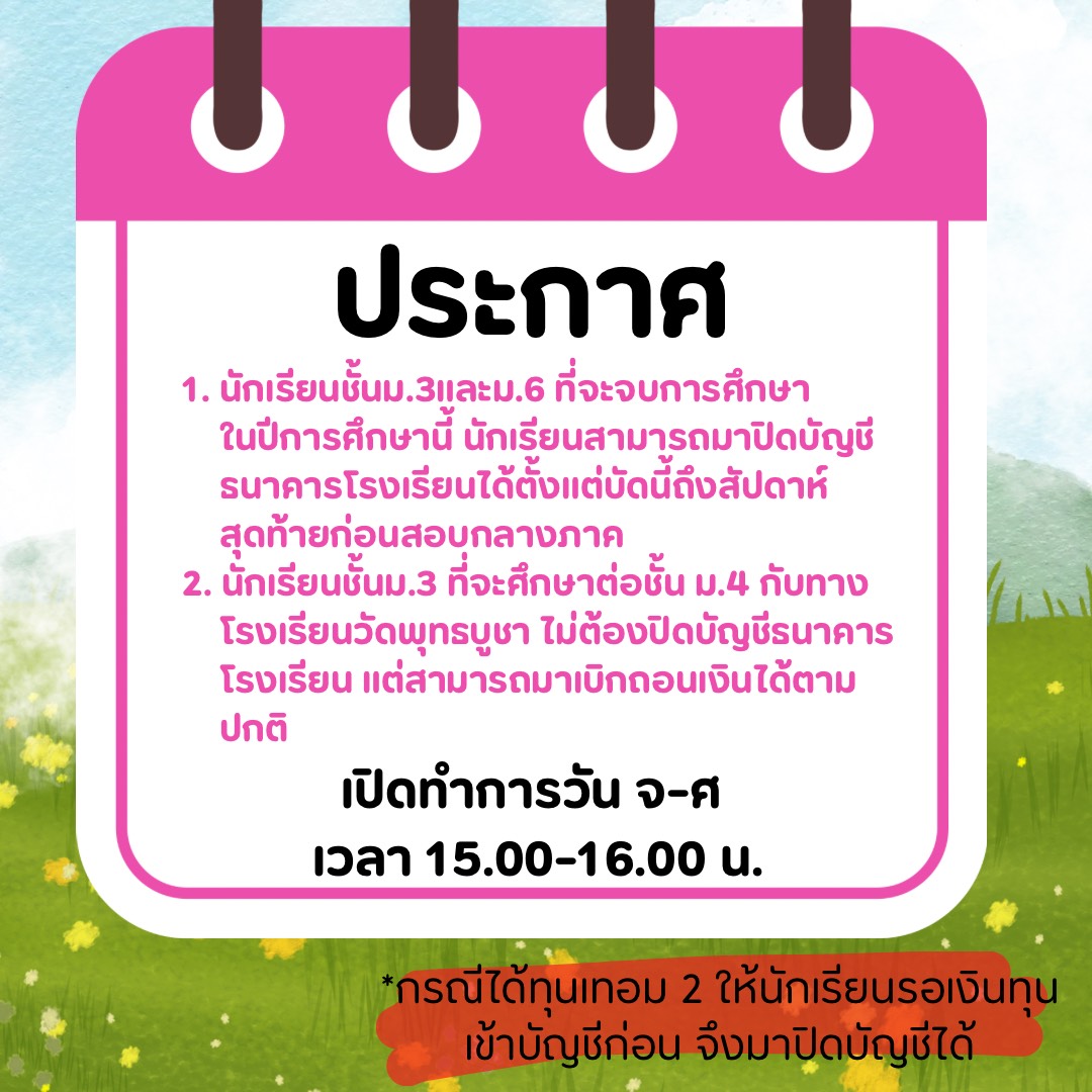 นักเรียนชั้น ม.3 และ ม.6 ที่จะจบในปีการศึกษา 2568 นี้ สามารถมาปิดปัญชีธนาคารโรงเรียนได้ครับ