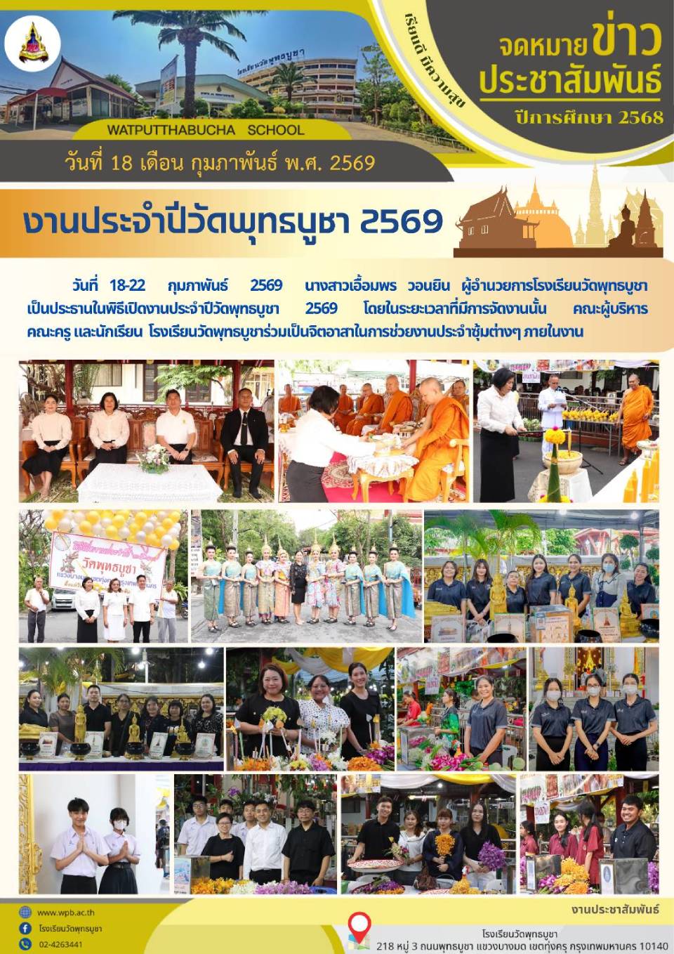 | วันที่ 18-22 กุมภาพันธ์ 2569 นางสาวเอื้อมพร วอนยิน ผู้อำนวยการโรงเรียนวัดพุทธบูชา เป็นประธานในพิธีเปิดงานประจำปีวัดพุทธบูชา 2569 โดยในระยะเวลาที่มีการจัดงานนั้น คณะผู้บริหาร คณะครู และนักเรียน โรงเรียนวัดพุทธบูชาร่วมเป็นจิตอาสาในการช่วยงานประจำซุ้มต่างๆ ภายในงาน |