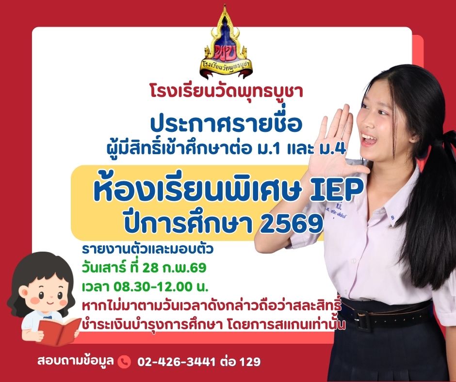 | ประกาศรายชื่อนักเรียนที่มีสิทธิ์เข้าศึกษาต่อ ม.1 และ ม.4 ห้องเรียนพิเศษ IEP ปีการศึกษา 2569 |