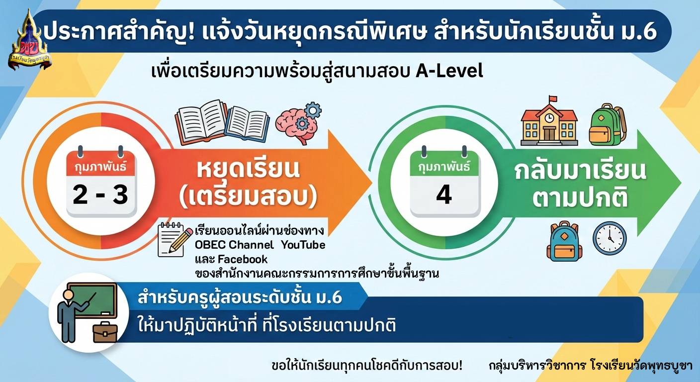 ประกาศหยุดเรียน ม.6 วันที่ ๒ - ๓ กุมภาพันธ์ ๒๕๖๙
